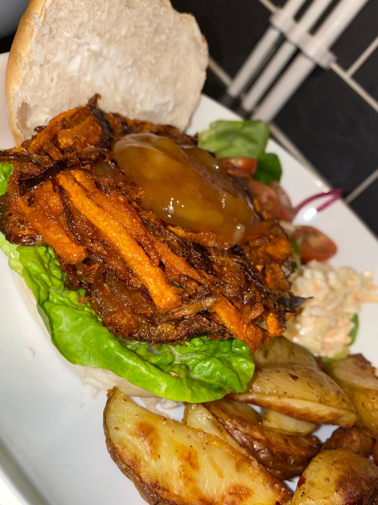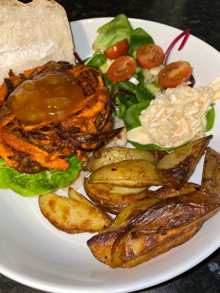 We served ours with a side salad and some homemade wedges! We bought some vegan friendly burger buns and inside the burger placed baby gem lettuce and mango chutney just to give it that extra Indian taste!