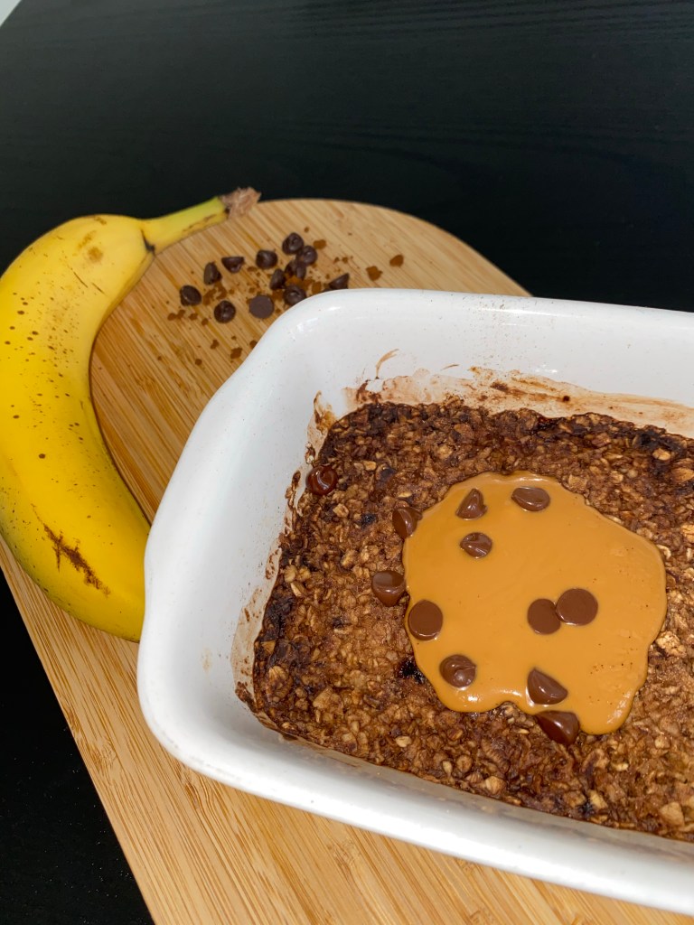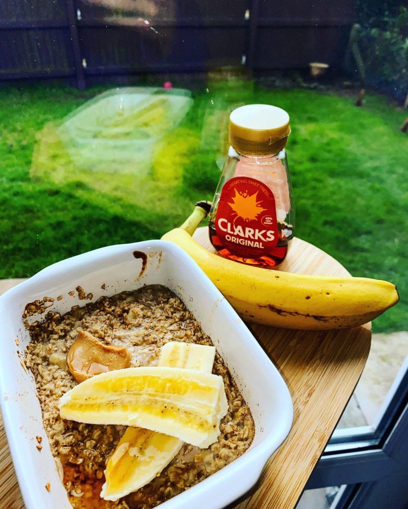 Place 5 tbsp of oats into an oven proof dish and mash half of a banana into it, then place half a tsp of cinnamon & the same amount of ground ginger. Then add just under 100ml of your face plant based milk. Mix all of this together and place a dollop of peanut butter in the centre. Bake this in the oven for 15 mins – I used gas 6. I then sliced the other half of the banana to serve and drizzled some maple syrup on top!